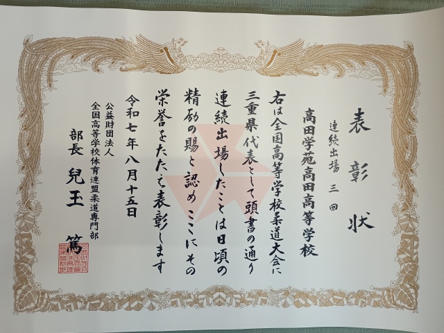 ※団体戦3年連続出場の表彰状をいただきました