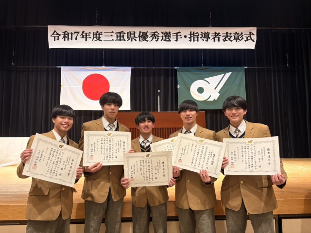 1月7日(水)に三重県庁にて令和7年度三重県優秀選手・指導者表彰式が行われました。令和7年度全国高等学校総合体育大会個人総合優勝および第79回国民スポーツ大会準優勝等の成績が認められ、本校新体操部Ⅲ年F組山本響士朗が特別優秀選手賞、Ⅰ年2組今村吏玖、Ⅰ年3組中澤陸、Ⅰ年3組村田駿、Ⅰ年5組佐川玄太が優秀選手賞を三重県教育長から表彰されました。表彰されたことに感謝し、次の大会に向けて更に磨きをかけて練習に励みたいと思います!